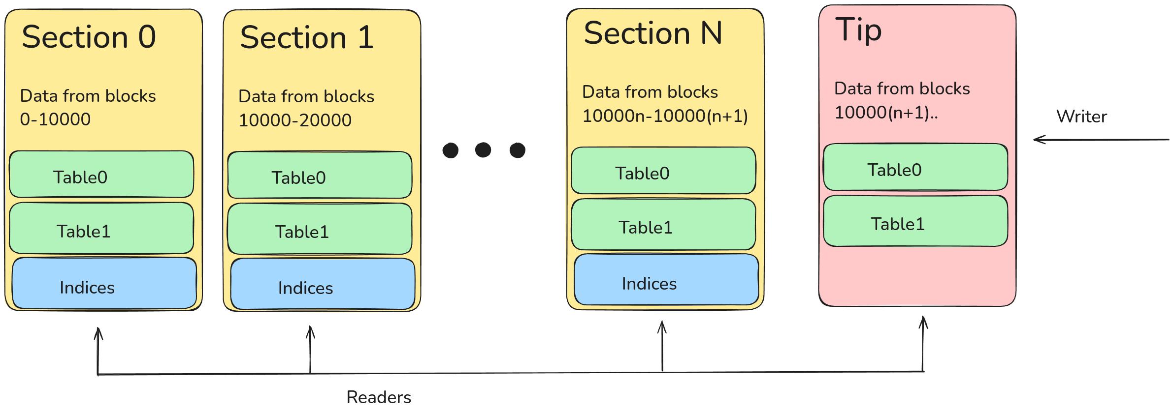 Note: It is easy enough to implement full or partial consistency so writes are not lost in case of a restart. But in-memory tip model is better for systems that just take raw blockchain data and store it. Bacause it can have low latency on writes, less IO, less disk tear.